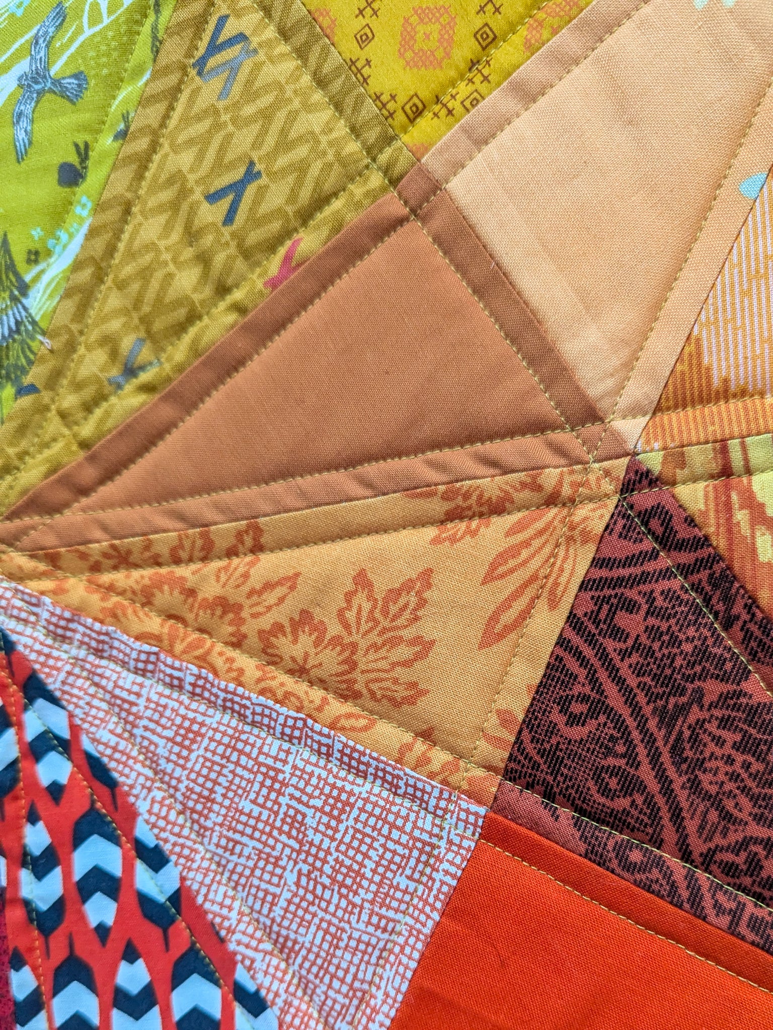 this scrappy geometric mini quilt is loaded with all the beautiful colors of fall. looking for a seasonal wall decor staple? or maybe a table center piece for your cozy family meals? this is it!