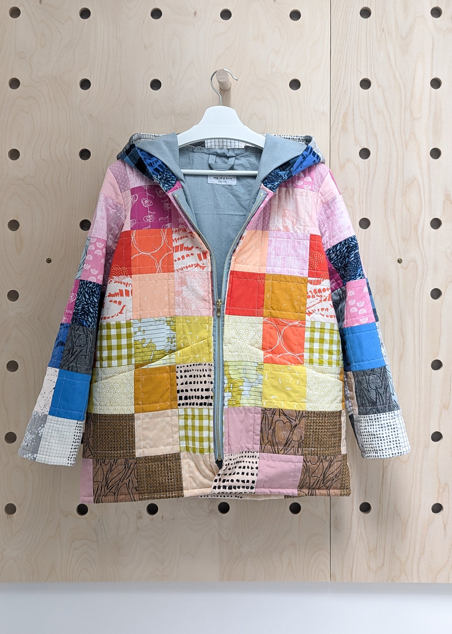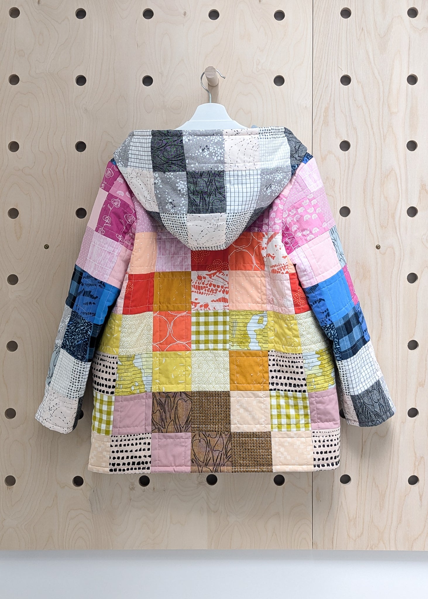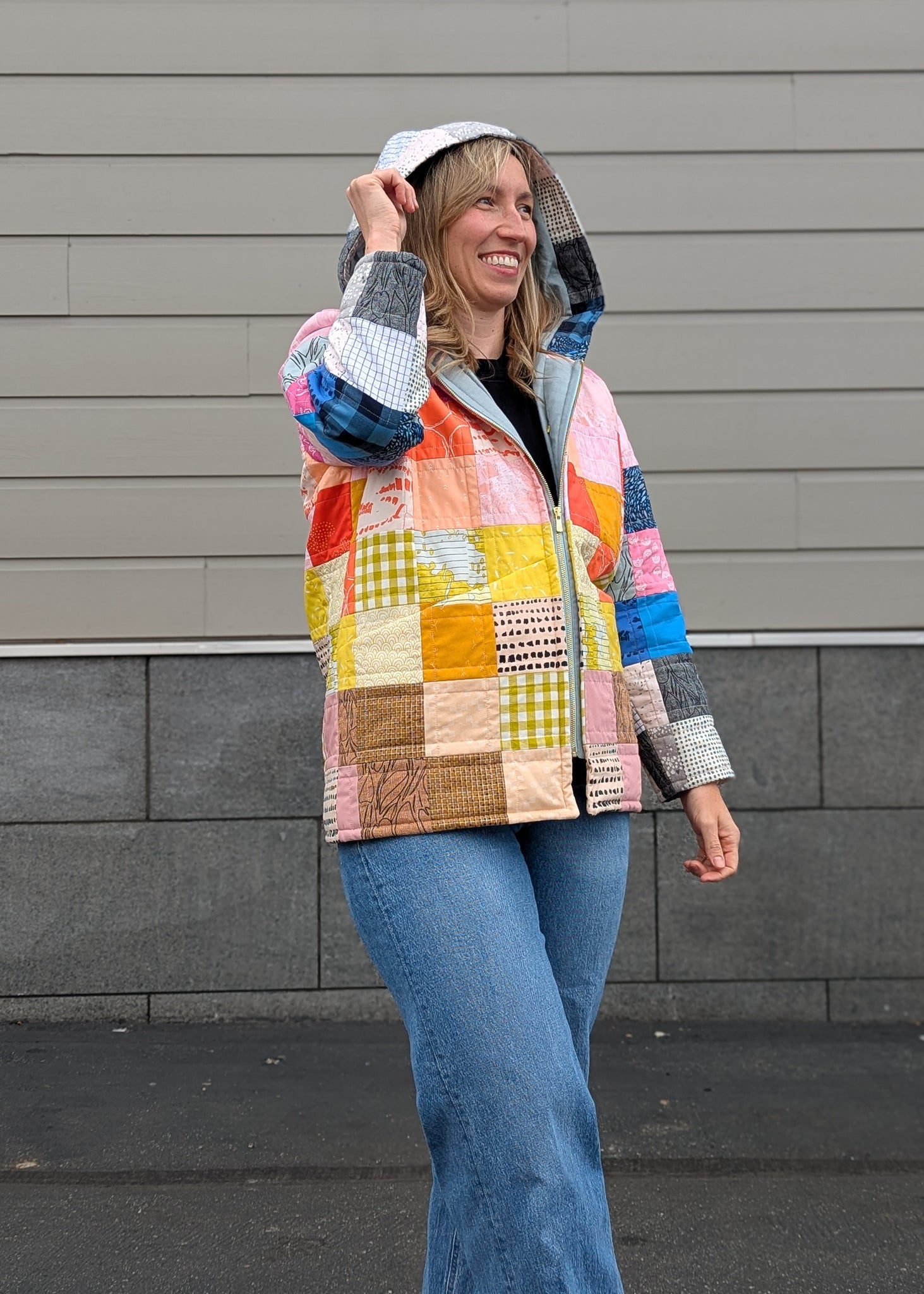 zipper closure. two front pockets. one interior zipper pocket. hooded.